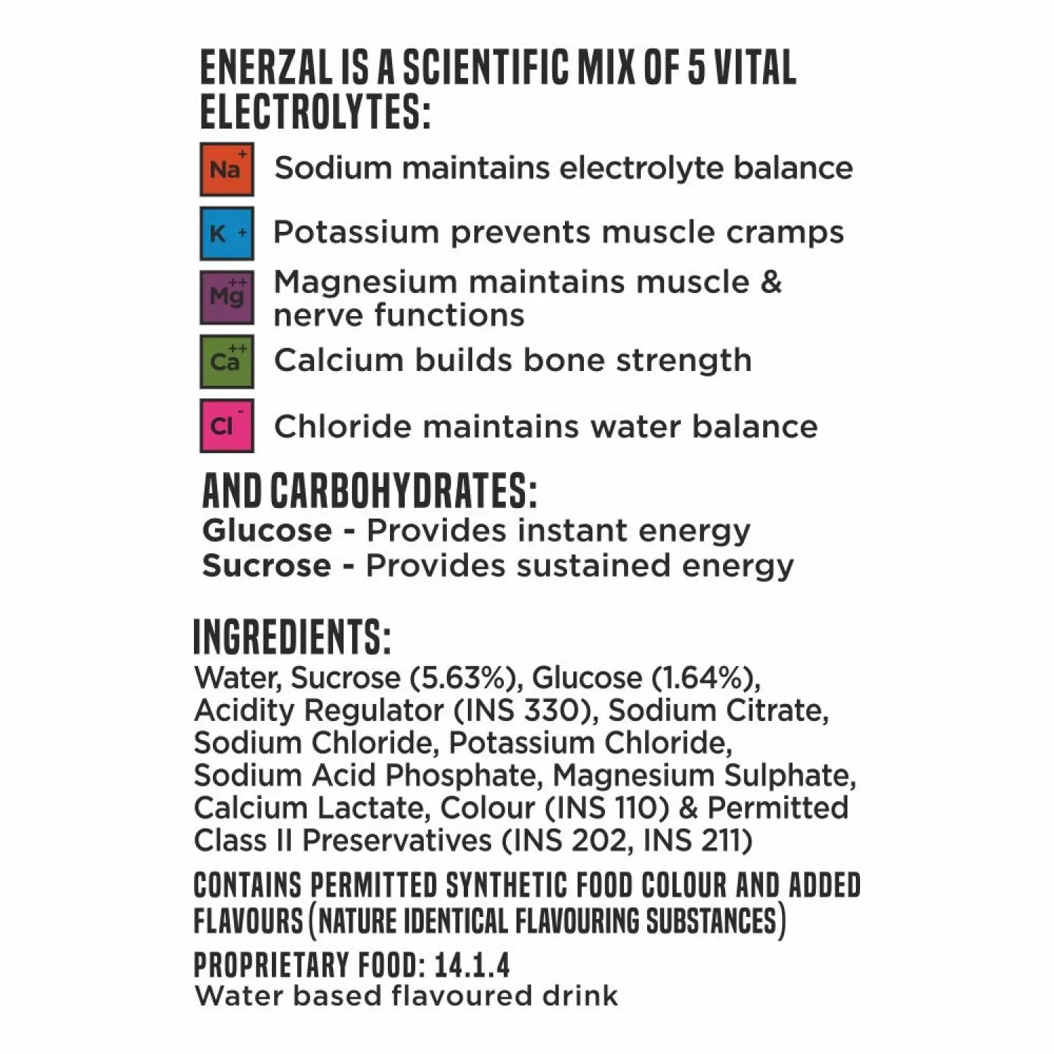 "Enerzal Balanced Energy Drink Powder contains carbohydrates, and electrolytes as the key ingredient. The balanced energy drink is available in orange and lime flavour and it helps to replenish the lost body salts during the day to day activities. Key benefits/uses of Energal: - Intake helps to replenish back the lost salts - Helps in maintaining the salt balance in the body - Prevents dehydration when taken with water - Provide Instant and sustained energy - Contains 5 vital electrolytes - Helps you recover faster, work longer and perform better. - Free from caffeine and preservative."